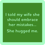 Add a perfectly sarcastic dose of humor to your home with the Embrace Her Mistakes Coaster, featuring the hilarious line: “I told my wife she should embrace her mistakes… she hugged me.” This witty coaster brings instant laughter to any coffee table, kitchen counter, nightstand, or bar cart — and it’s guaranteed to be a crowd favorite with husbands, wives, and anyone who appreciates a good marriage joke.