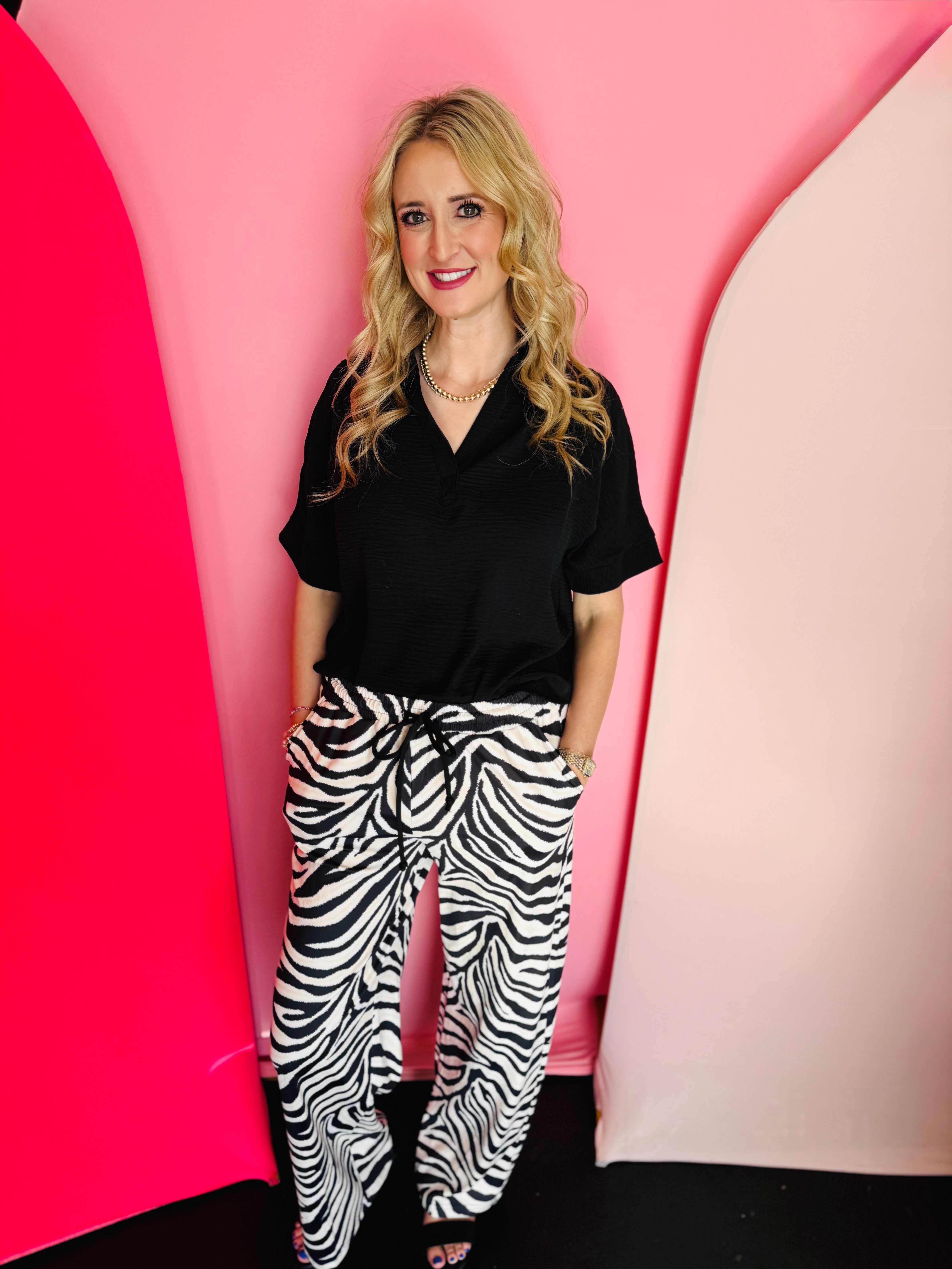 Black and white zebra print wide-leg jogger pants with stretchy fabric and bold safari style.