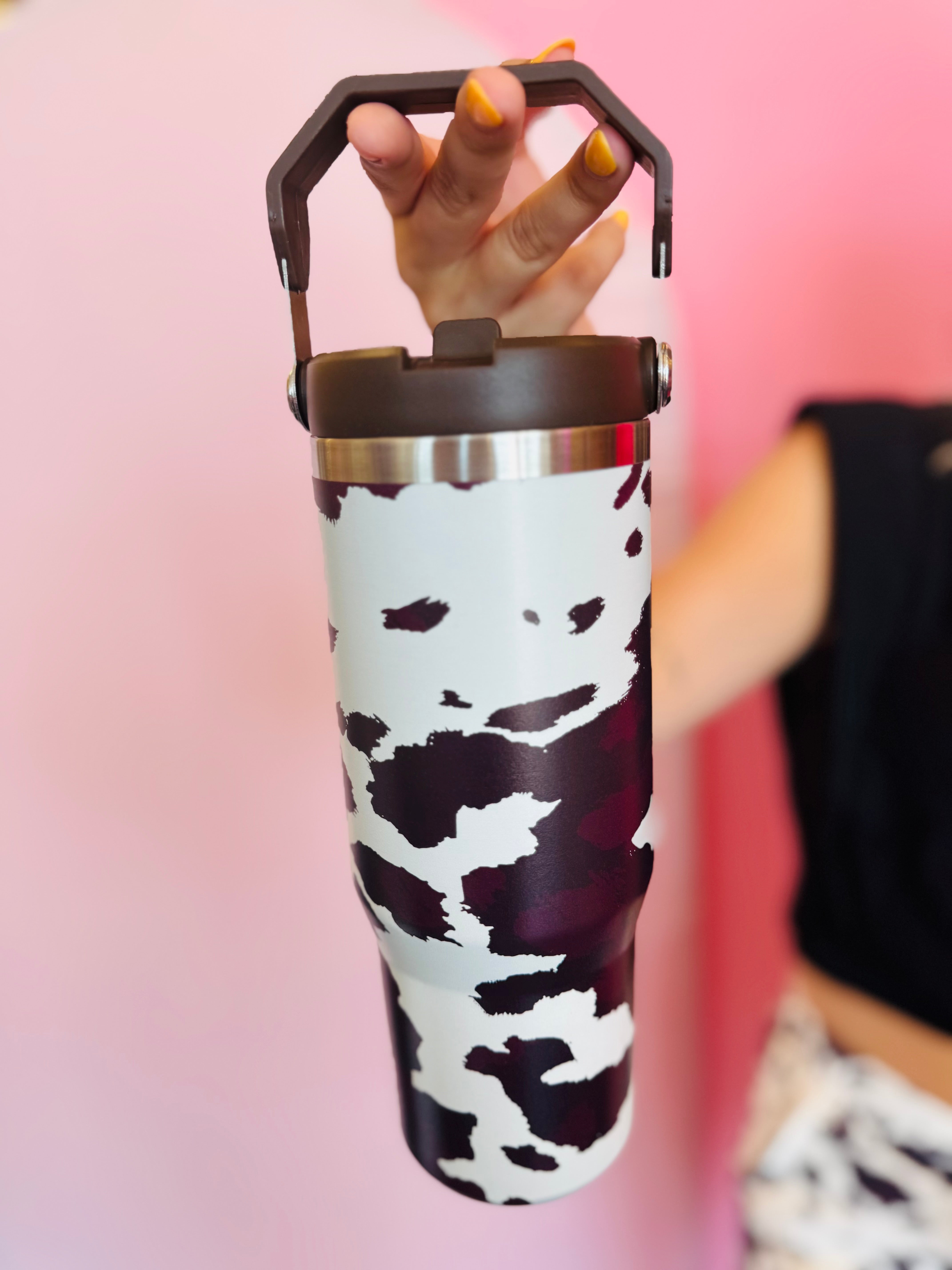 Sip in style with our Cowhide Couture Travel Tumbler, the perfect blend of playful charm and everyday function. Featuring a fun chocolate cow print, this 30oz tumbler is designed to keep your favorite beverages—hot or cold—at the perfect temperature while turning heads wherever you go. The screw-on lid with a convenient handle makes it easy to grab and go, while its car cup holder–friendly design ensures it fits seamlessly into your daily commute or road trips. Plus, it’s dishwasher safe, so cleanup is quick and easy. Whether you’re a coffee enthusiast, tea sipper, or iced drink lover, this tumbler will be your new favorite travel companion. Take your milk (or coffee) on the mooove and add some cowhide chic to your routine!