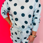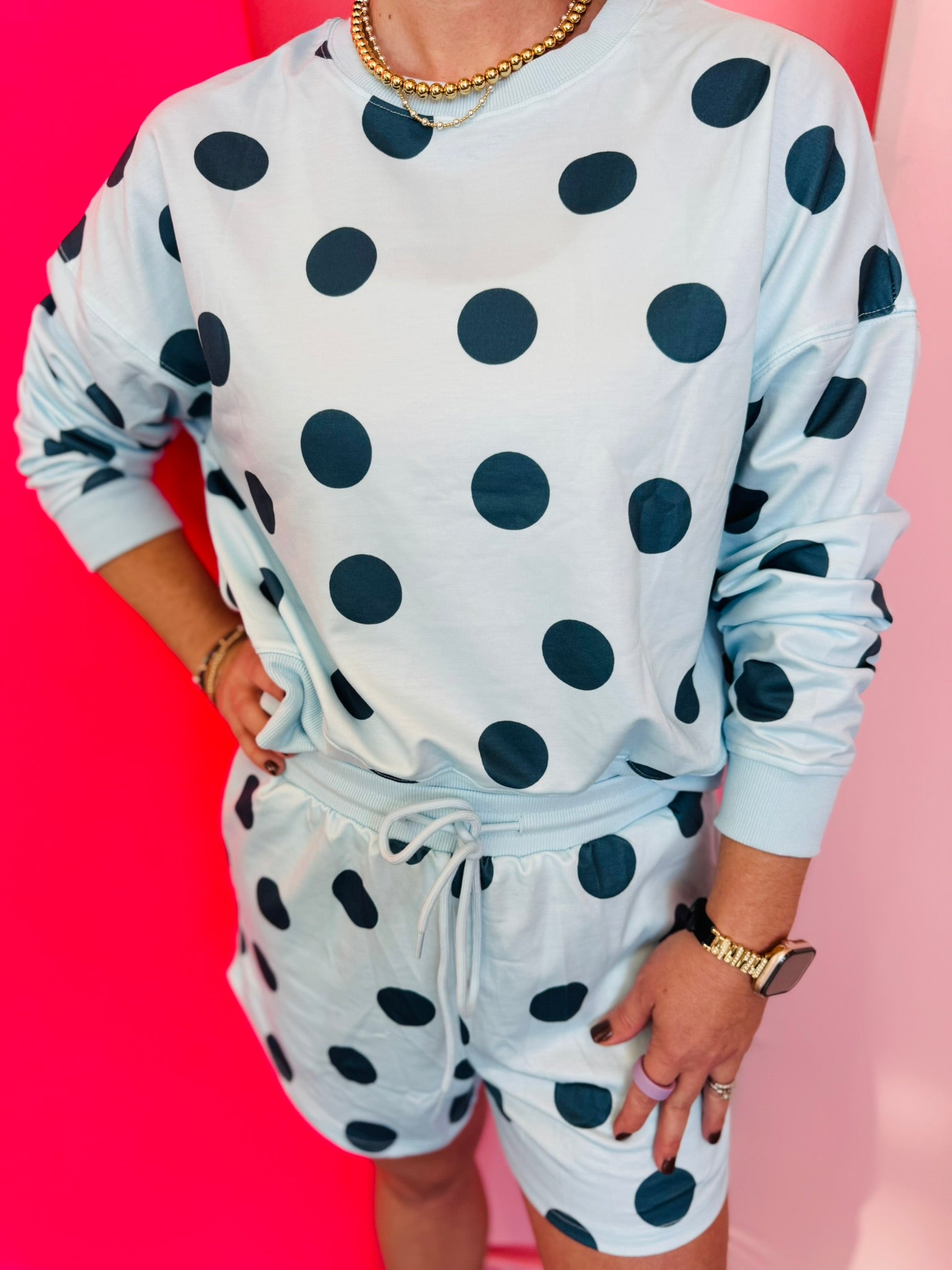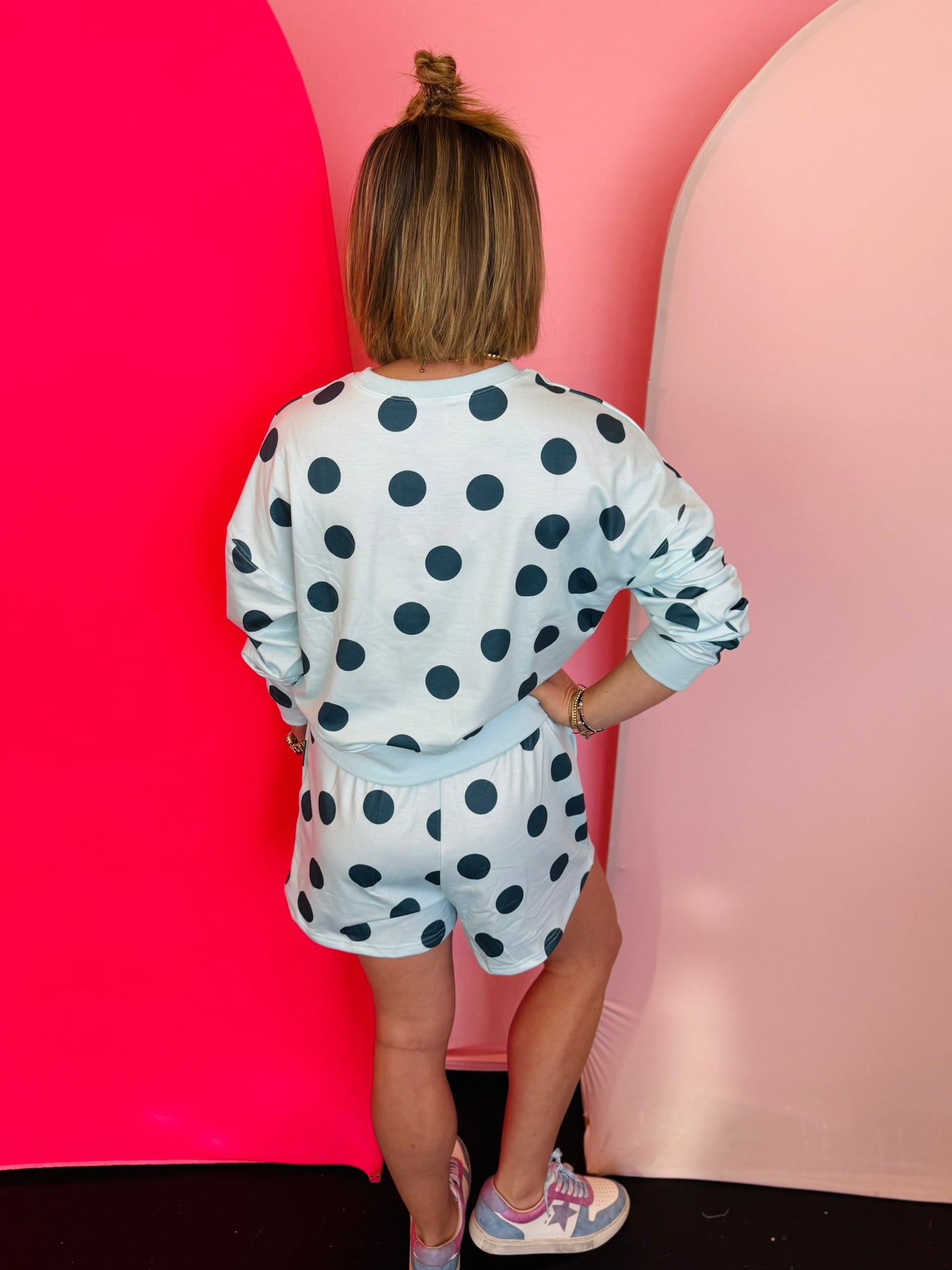 Relax in playful comfort with the Sky Blue Polka Dot Shorts Set, a cute and cozy two-piece lounge outfit designed for effortless everyday wear. Made from a soft, lightweight blend of polyester and elastane, this set offers breathable comfort with just the right amount of stretch. The long sleeve pullover top features a relaxed silhouette with dropped shoulders, giving it an easy, laid-back feel that’s perfect for lounging, travel days, or casual errands.
