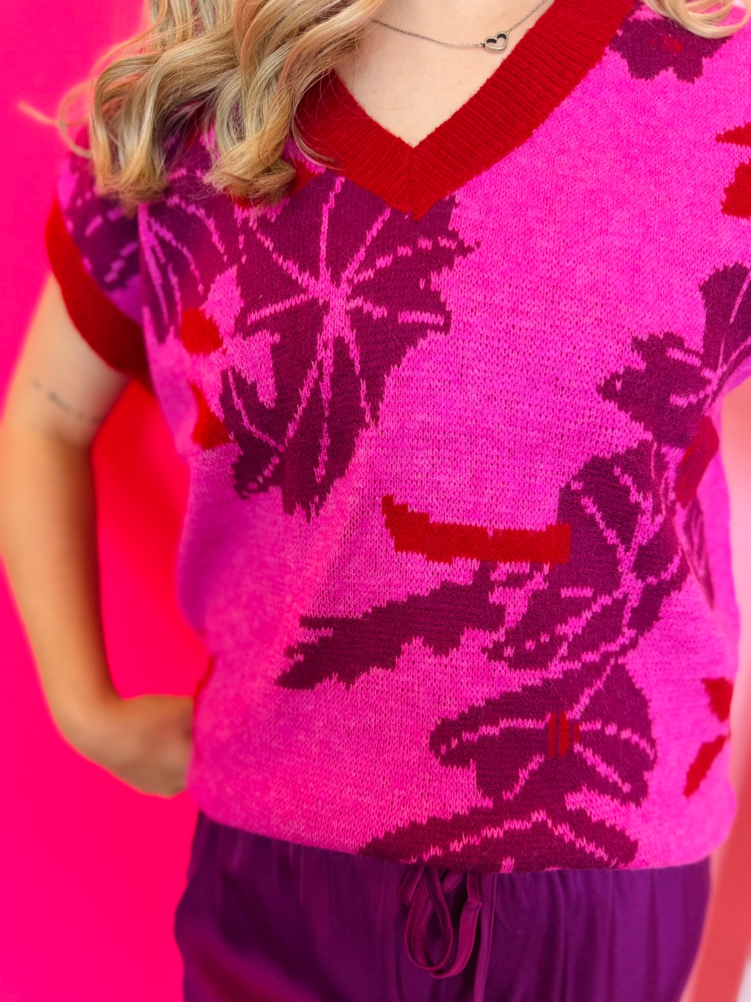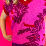 Fuchsia floral knit vest with V-neck and ribbed trim at sleeves and hem.