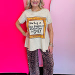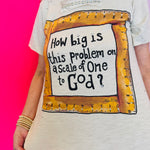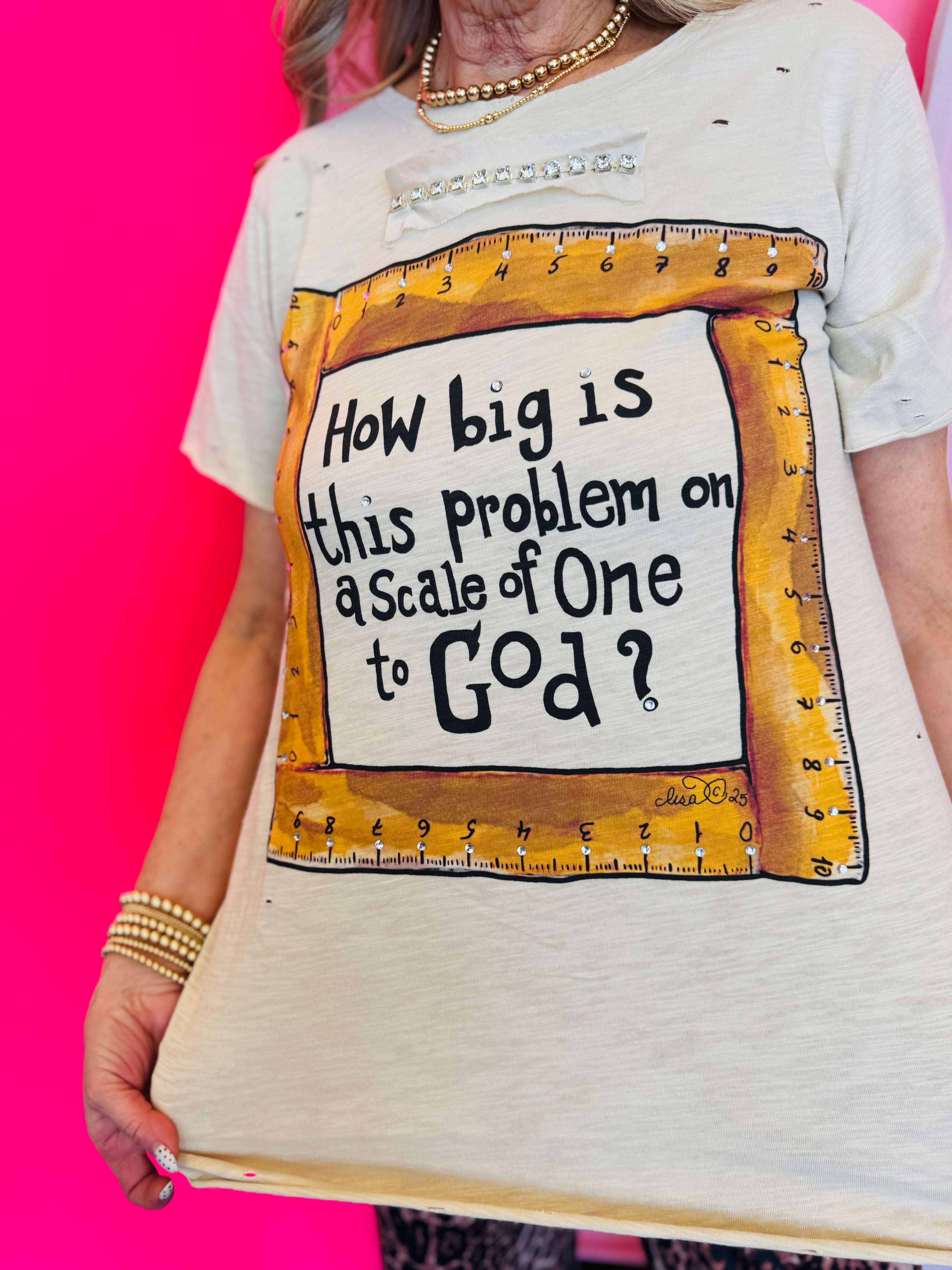 Need a reminder to keep things in perspective? The How Big Is This Problem Tattered Tee delivers a powerful message with a stylish, edgy twist. Set on a soft neutral base, this 100% cotton tee features a hand-drawn ruler frame surrounding the thought-provoking phrase, “How big is this problem on a scale of one to God?”—making it both meaningful and eye-catching.