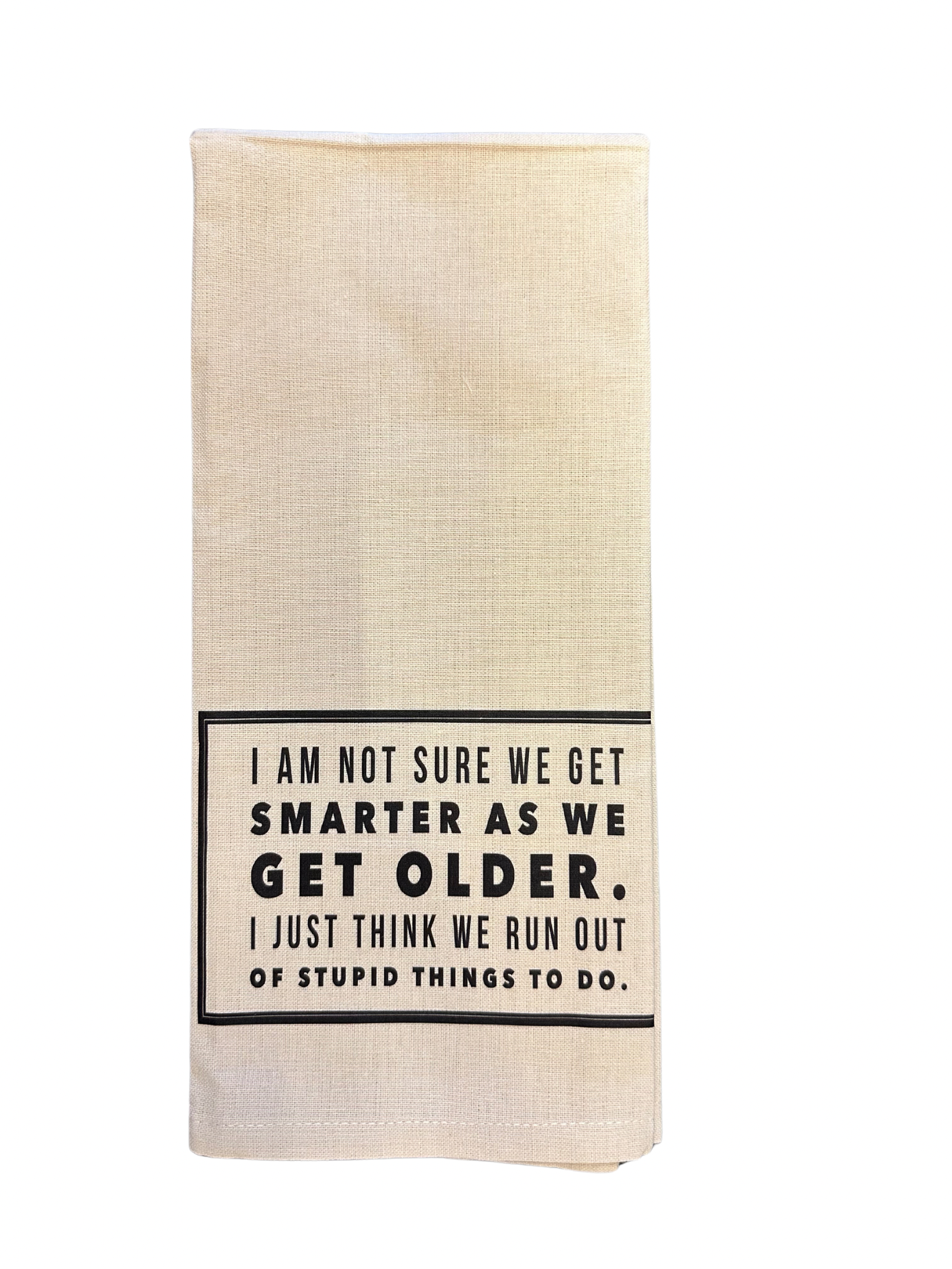 Embrace the wisdom of age (and laugh a little) with our "I Am Not Sure We Get Smarter" tea towel. This quirky towel features a playful phrase and a charming design, making it both functional and fun. Perfect for any kitchen, this tea towel is sure to bring a smile to your face every time you use it!