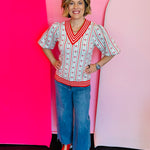 Embrace charming style with our Faith In A Bow Sweater! This delightful knit top features intricate zigzag patterns forming a vibrant red bow design, beautifully set against a classic cream background. The sweater is finished with bold red and white striped trim, elegantly adorning the neckline, sleeves, and hem. This eye-catching detail provides a playful yet sophisticated touch. Crafted from a soft blend for ultimate comfort, it’s perfect for adding festive flair or unique charm to your everyday wardrobe.