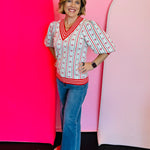 Cream colored sweater with red striped v-neck, sleeves, and hemline. Bow and zig zag pinstripe design.