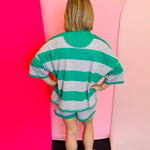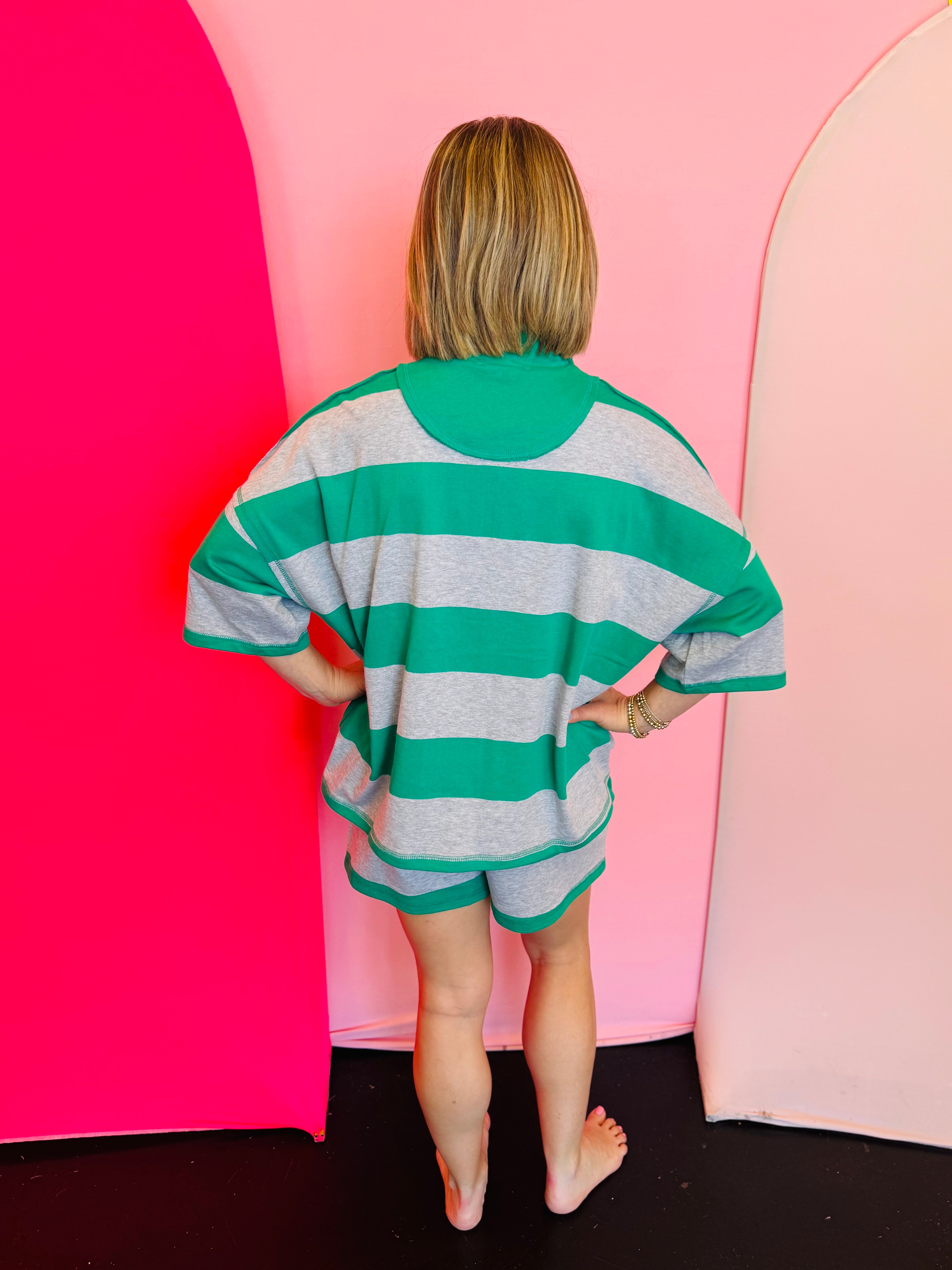 The Kelly green stripe brings energy and confidence to your wardrobe while still being wearable and versatile. Pair it with sneakers for a sporty vibe or slides for a relaxed, off-duty look.