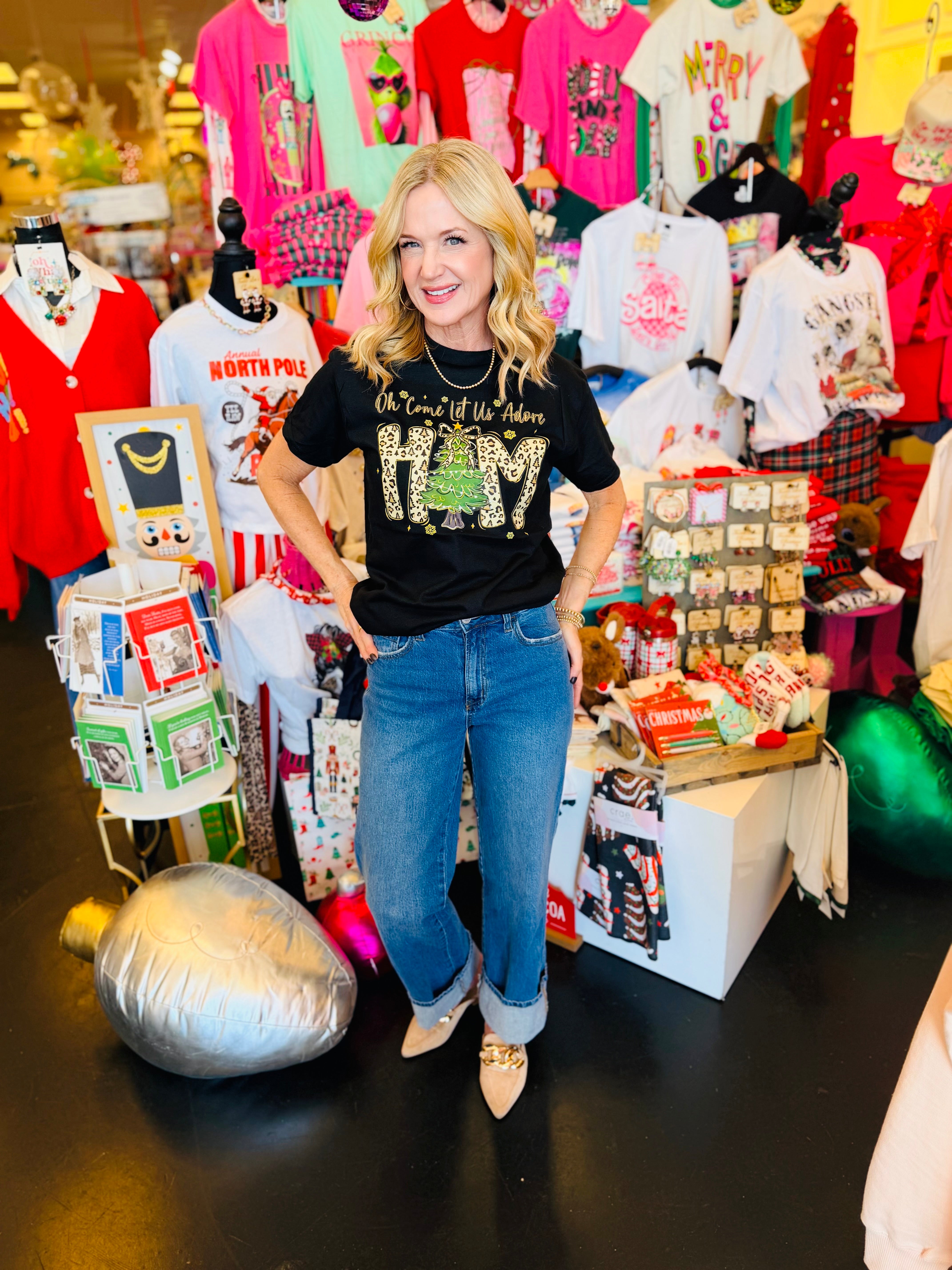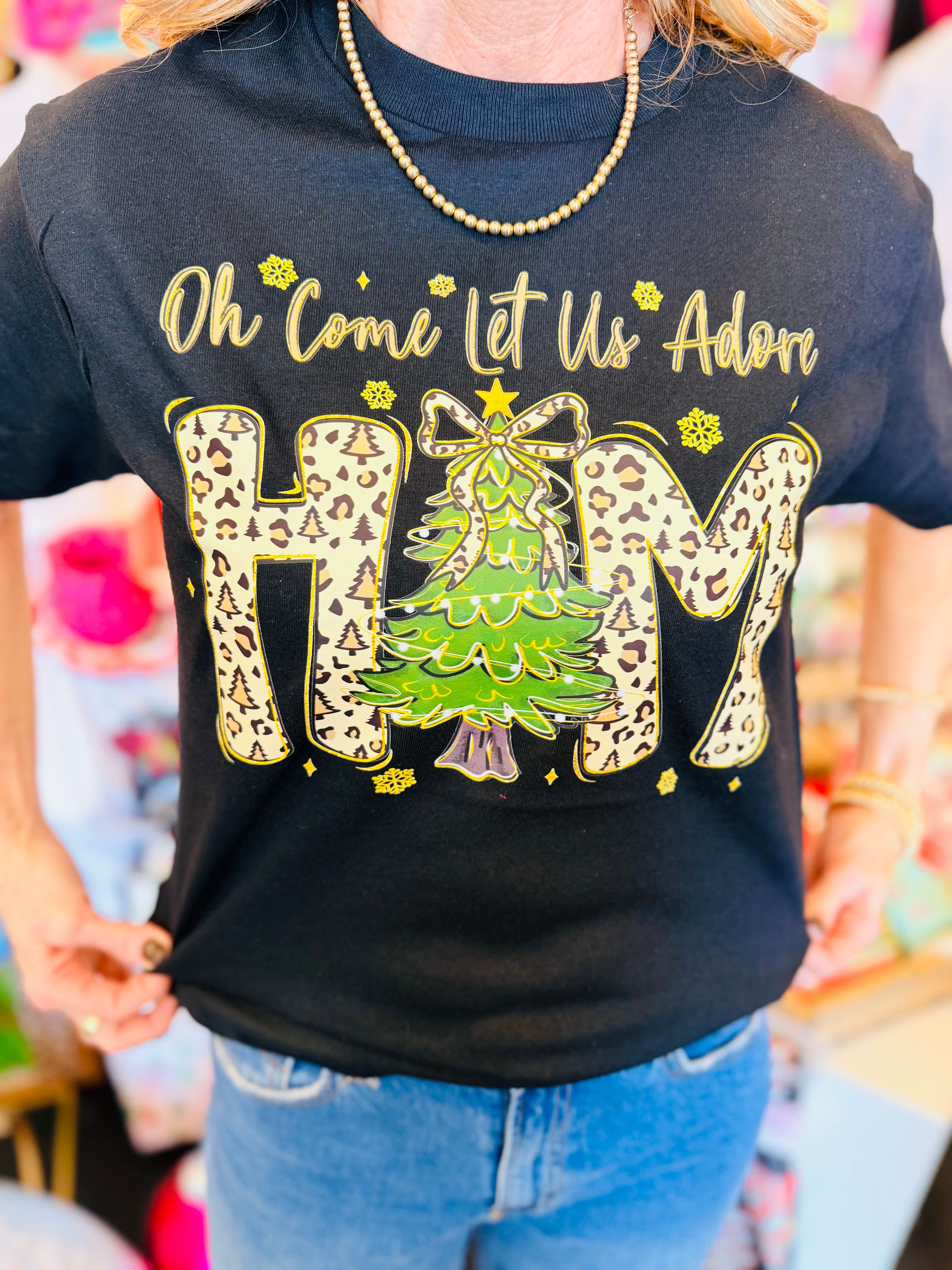 Faith, style, and a touch of wild—this tee brings it all together. The Adore Him Leopard Tree Tee is crafted from 100% soft cotton and features a bold black background that makes every detail pop. The phrase “Oh Come Let Us Adore Him” is paired with a stunning HIM graphic filled with festive leopard print for a modern, boutique-worthy twist.
