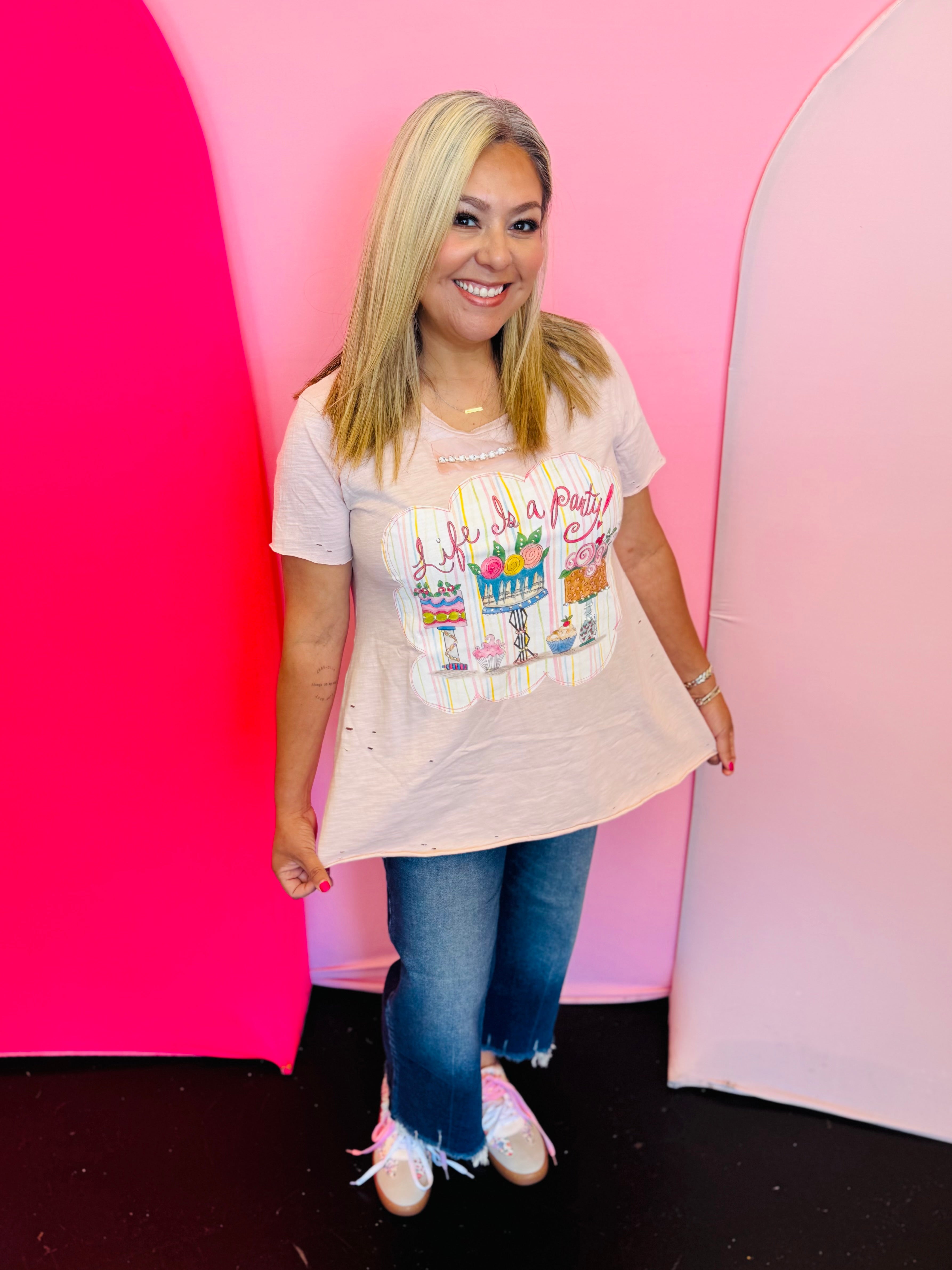 Ready to celebrate every day in style? The Life Is A Party Tattered Top brings fun, color, and a little sparkle to your everyday wardrobe. Designed on a soft neutral base with vintage-inspired pastel tones, this 100% cotton tee features a playful cake-themed graphic with hand-drawn artwork that adds a unique, artistic touch. The colorful details pop beautifully, giving it a cheerful, feel-good vibe that’s perfect for any casual outfit.