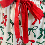 Drift into festive comfort with the Midnight Bow Pajama Set, a charming blend of holiday cheer and everyday luxury. This two-piece pajama set includes a short-sleeve, button-down top and coordinating long pants, both decorated with cheerful red and green bow prints that bring a joyful touch to your holiday season. A red drawstring waist tie adds a bright pop of contrast and ensures the perfect adjustable fit for cozy relaxation. Designed with soft, stretchy fabric, this set offers lightweight breathability and effortless comfort—ideal for lounging by the tree, wrapping gifts, or enjoying festive movie nights. Finished with delicate ruffle detailing, it’s a timeless addition to your holiday sleepwear collection that combines playful style with ultimate comfort.