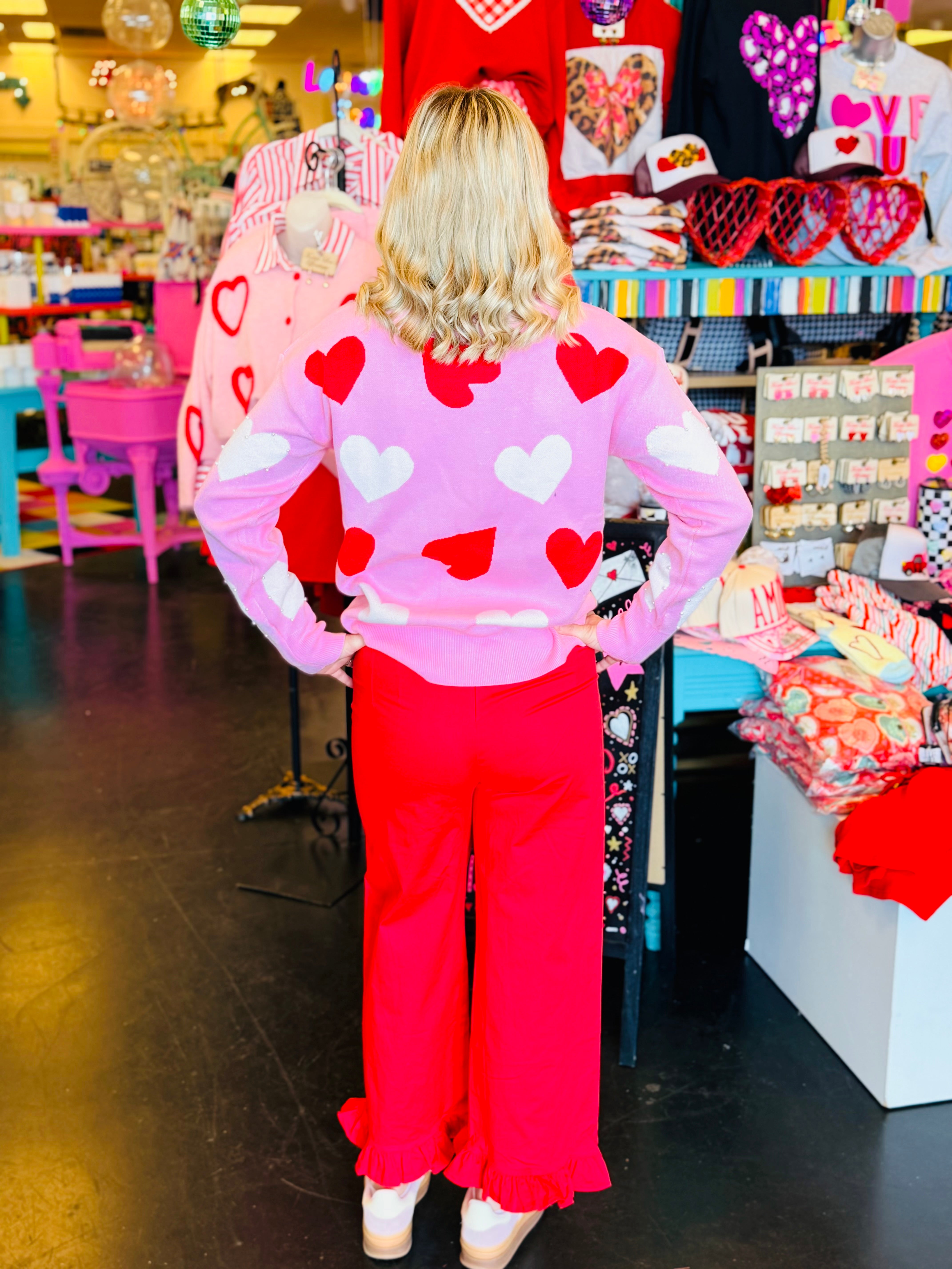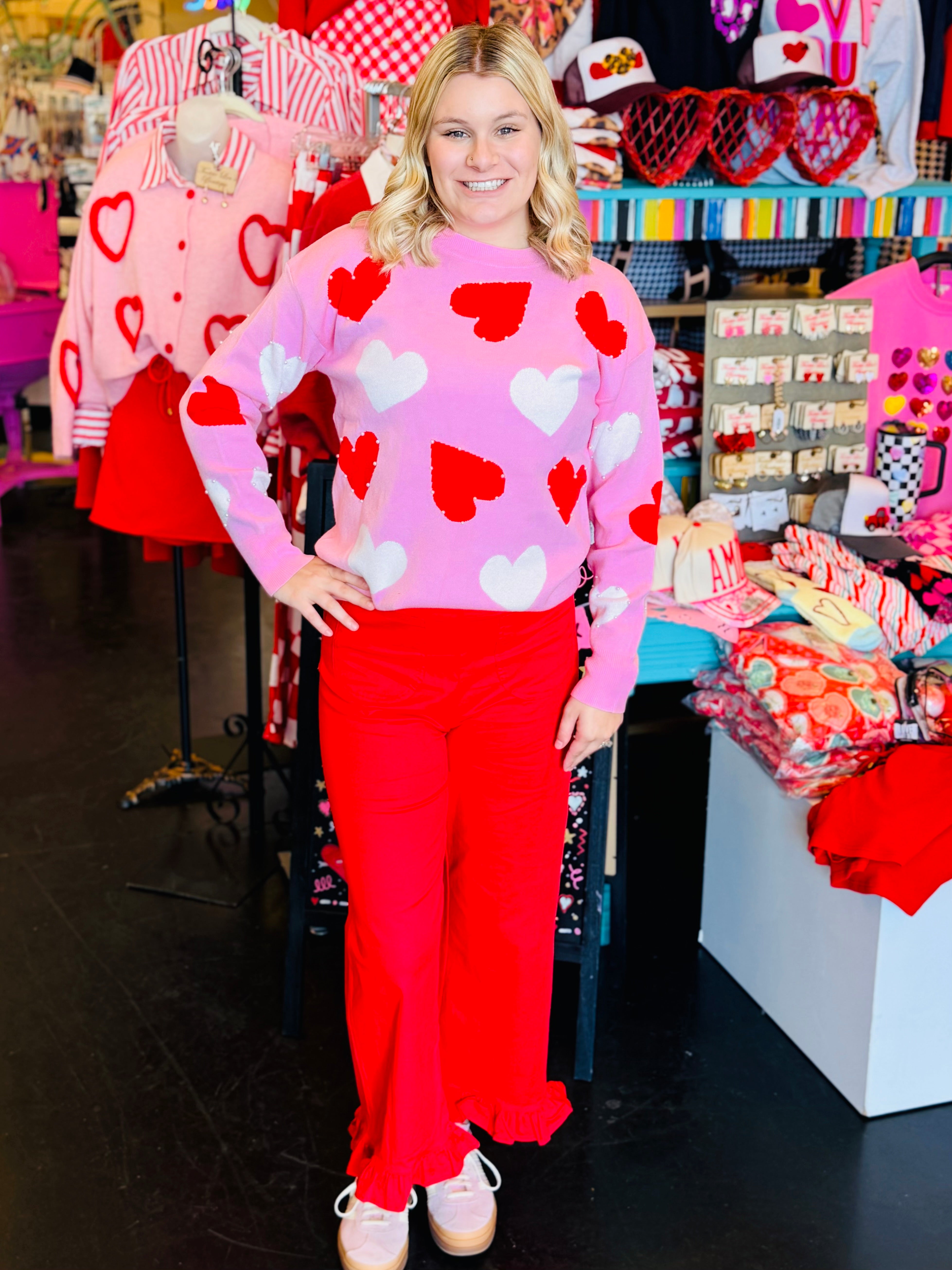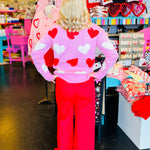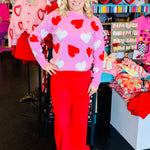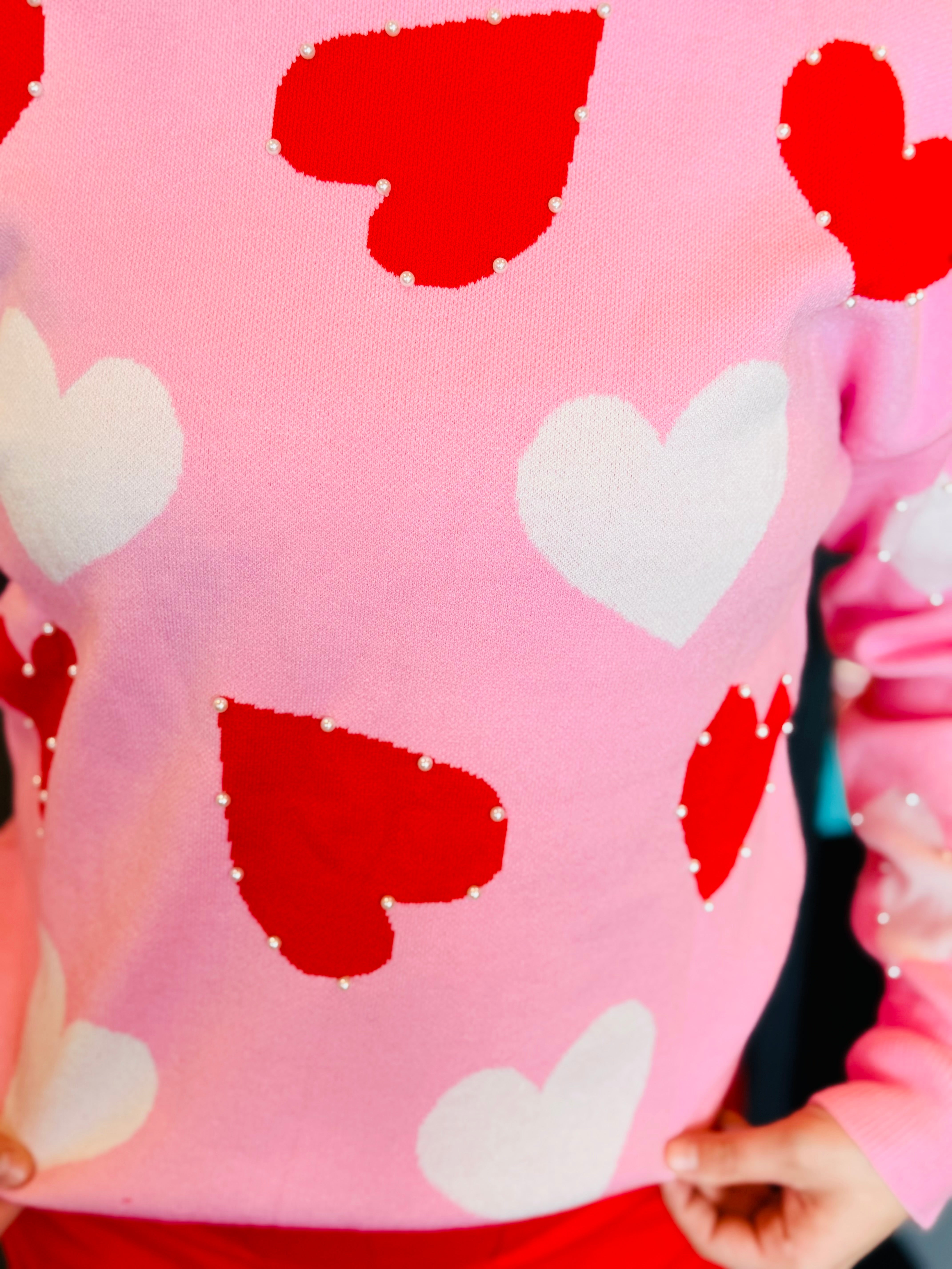 What truly elevates this sweater are the delicate pearl accents outlining the red hearts, adding a refined touch of sparkle and texture without overpowering the design. Finished with ribbed cuffs, neckline, and hem, this sweater maintains a flattering shape and polished silhouette. Perfect for Valentine’s Day, date nights, festive gatherings, or adding a little love to everyday outfits, this heart sweater pairs beautifully with denim, skirts, or tailored pants.