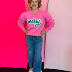 Spread holiday cheer with our Pink Merry Sweatshirt! This delightful top features a vibrant pink base, bringing a playful festive spirit to your wardrobe. The front proudly displays bold green chenille lettering that elegantly spells out "merry," creating a soft, textured, and eye-catching focal point. This cozy sweatshirt ensures both warmth and a flattering fit, offering ease of movement for all your seasonal activities. It’s perfect for casual holiday gatherings or adding festive joy to your everyday style.