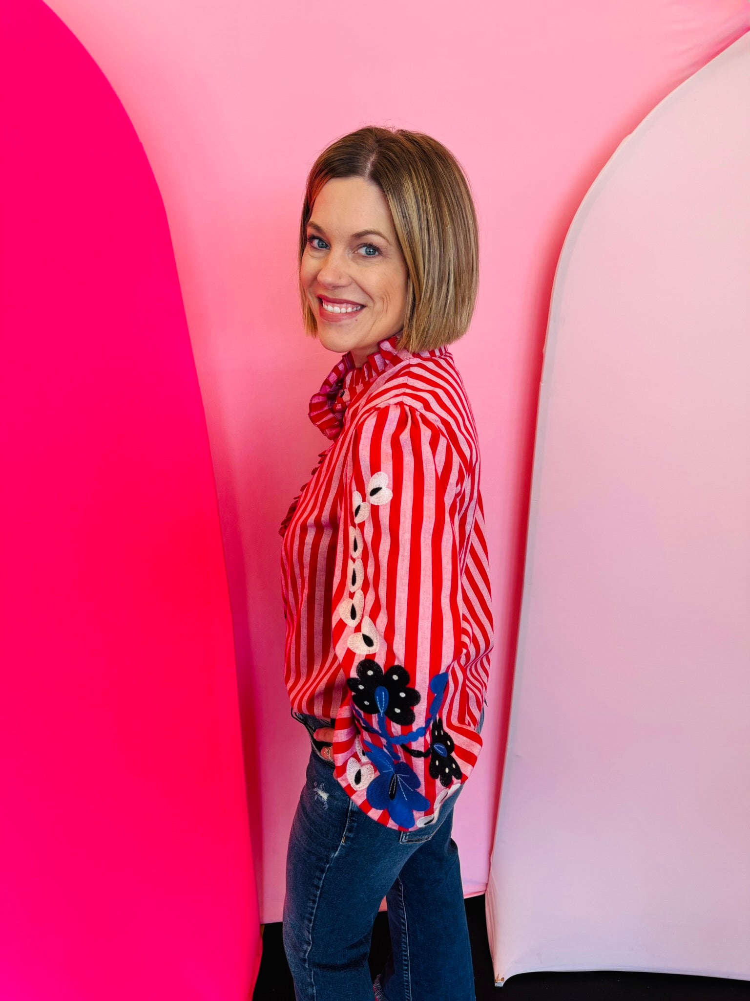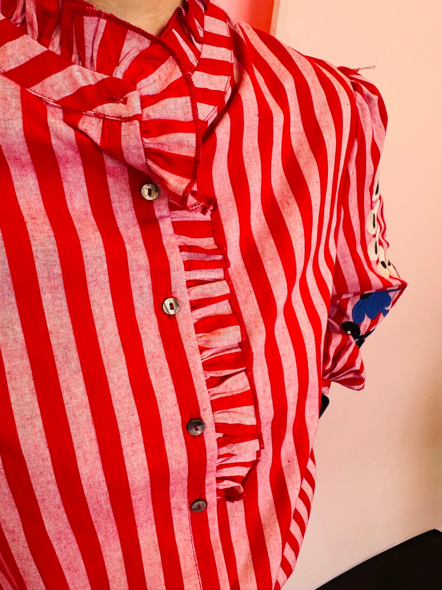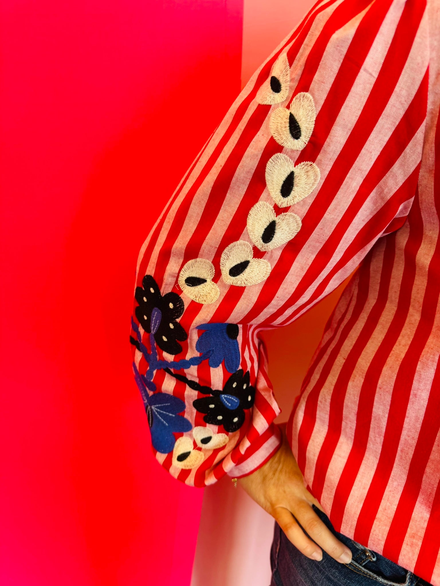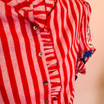Red and white striped cotton blouse with puff sleeves, floral embroidery, and ruffle trim detail.