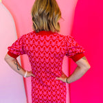 Indulge in sophistication with our exclusive red dress featuring pink abstract designs. The puff short sleeves add a touch of elegance while the collared v-neck enhances your silhouette. Elevate your style and stand out in this luxurious piece.