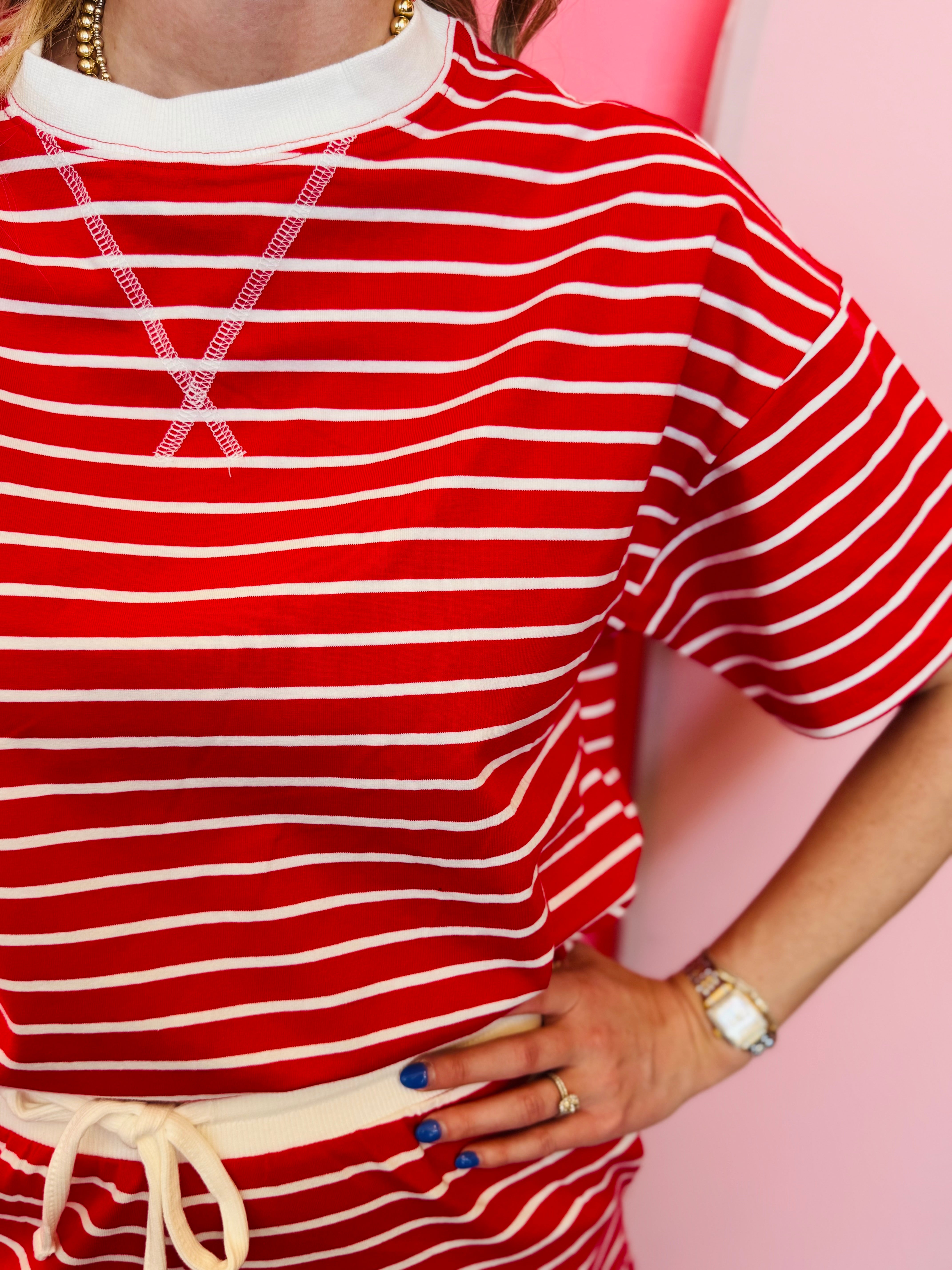 Made from a soft cotton-blend fabric with added stretch, this set feels breathable and flexible while holding its shape throughout the day. The tee includes a classic round neckline with a durable Dorito stitch detail for subtle structure. The matching shorts feature an elastic waistband for a comfortable fit and functional side pockets for added convenience. The vibrant red stripe pattern adds energy and personality while remaining easy to style.
