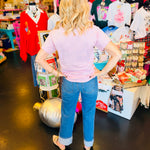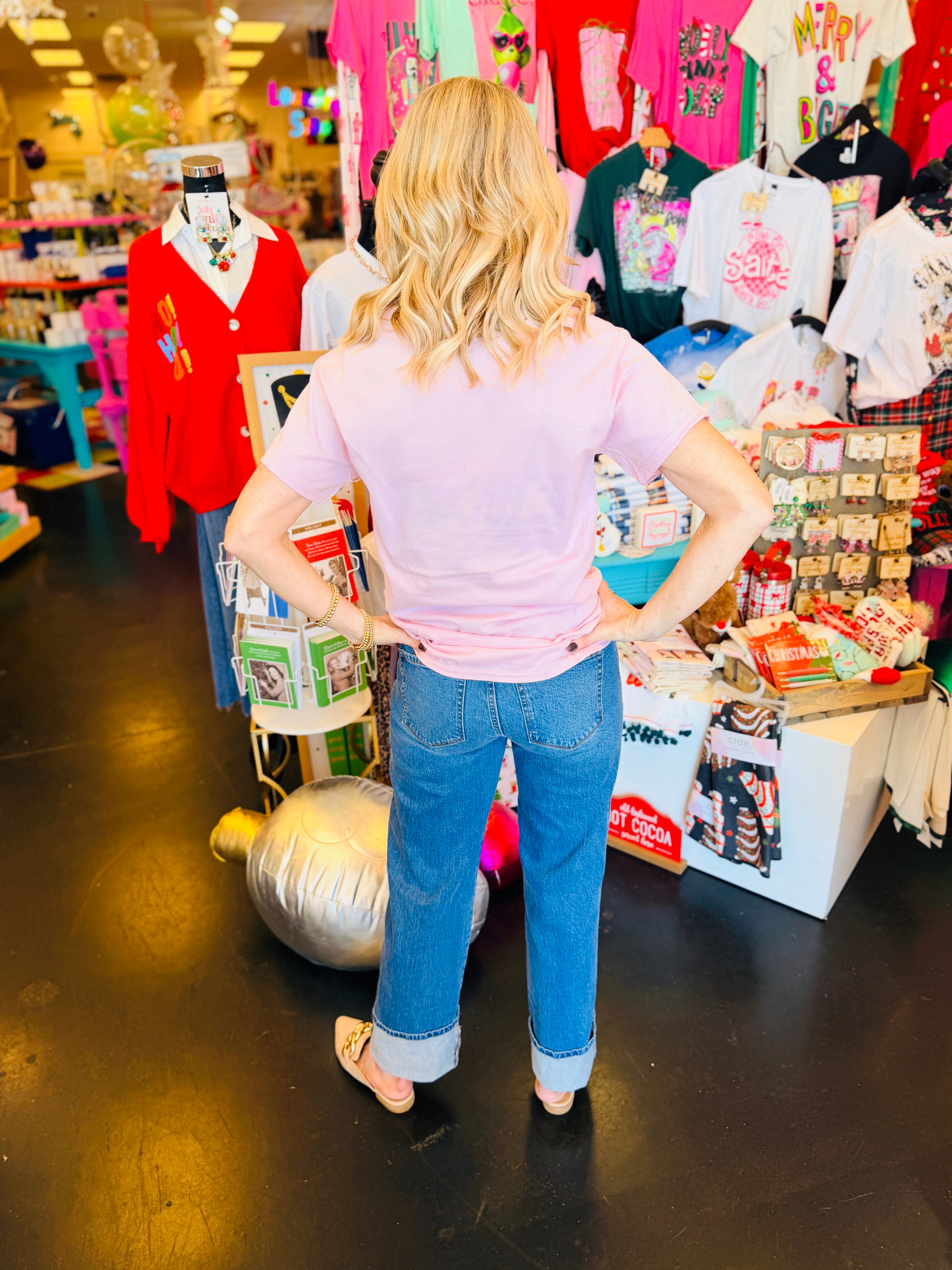 Light pink graphic tee with colorful holiday print