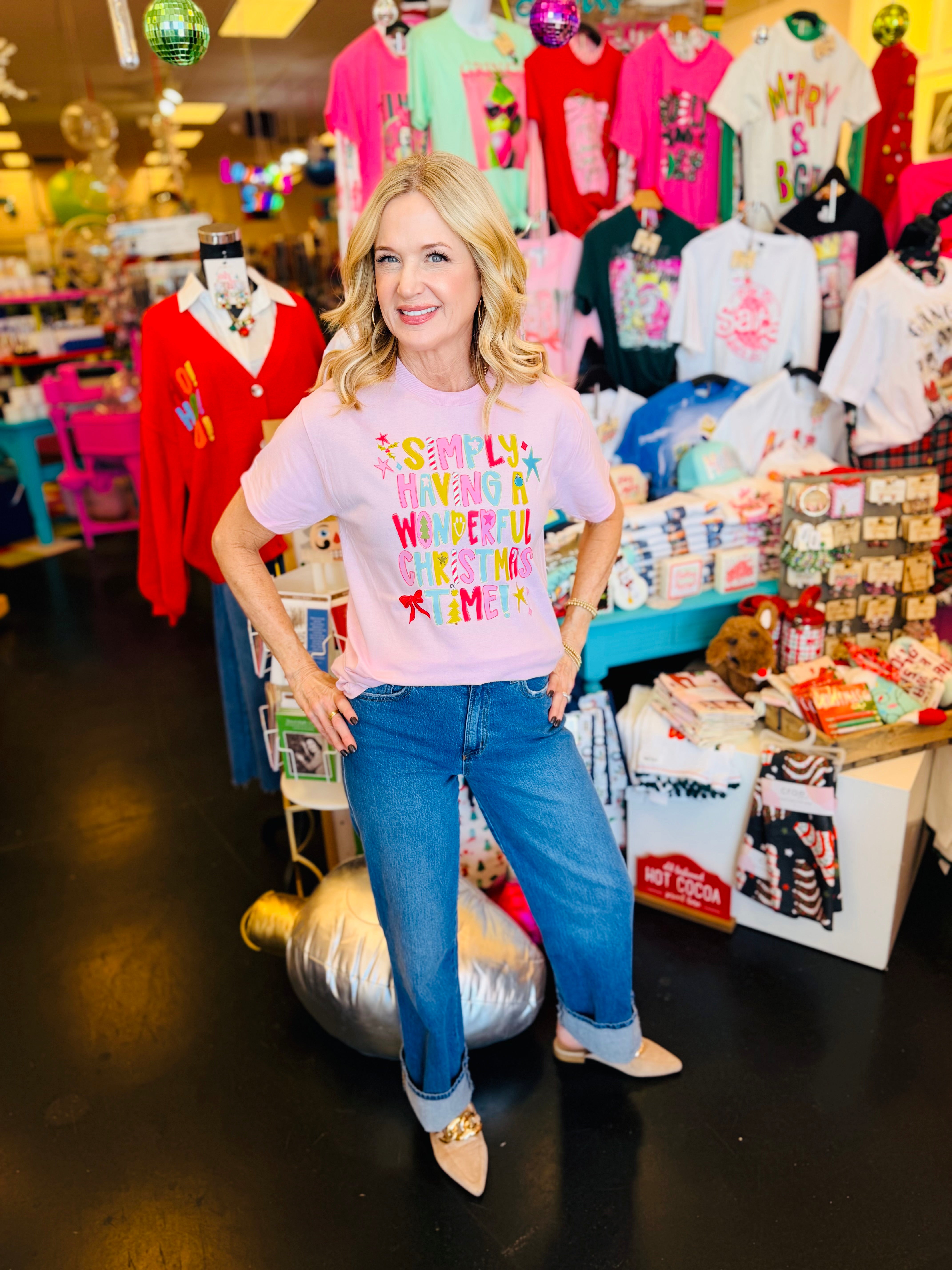Bright, cheerful, and full of festive charm—the Wonderful Christmas Time Tee brings instant holiday joy to any outfit. Crafted from 100% soft cotton, this light pink graphic tee features a colorful Christmas-inspired print with bold lettering, candy cane stripes, sparkling stars, and playful Christmas trees.