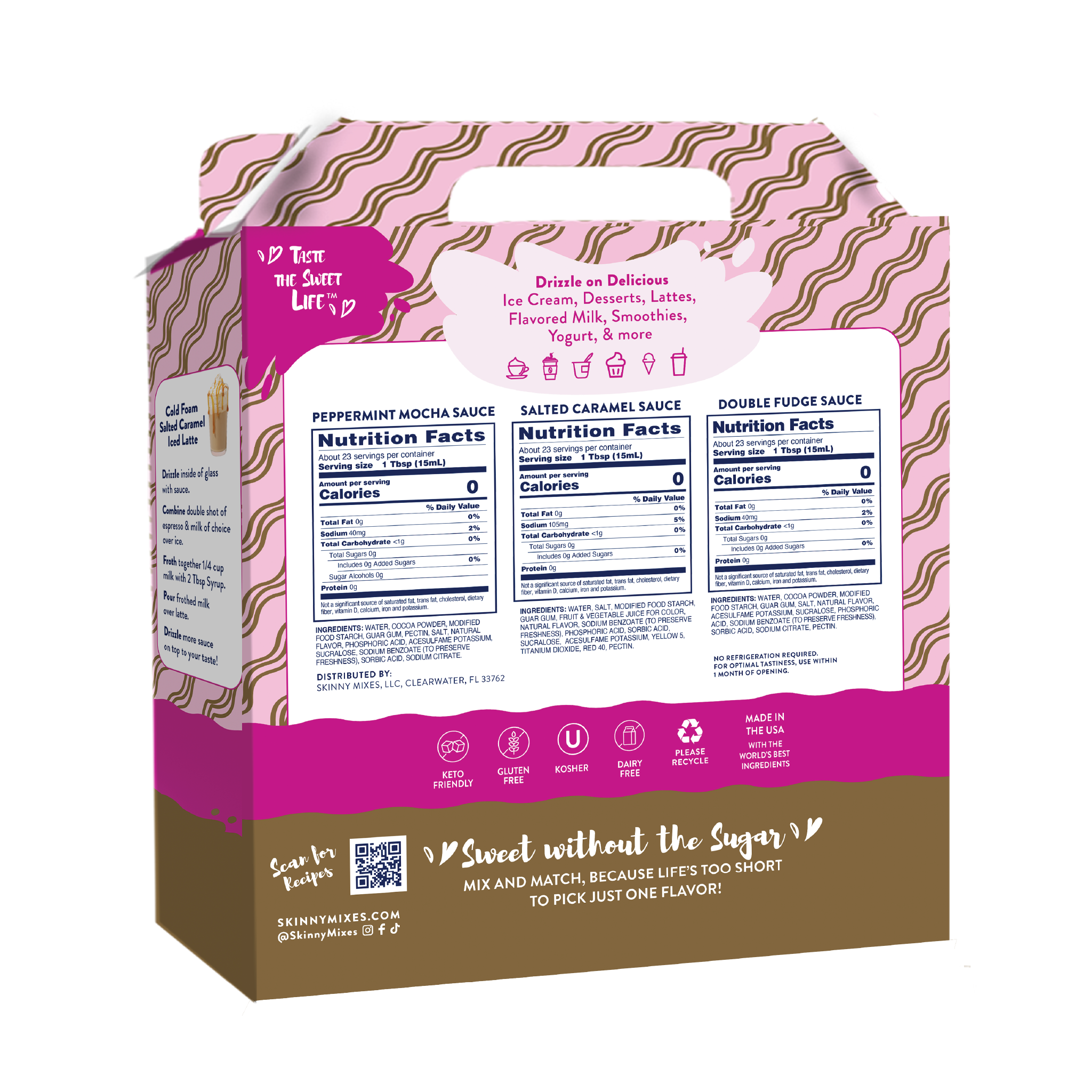 Bring holiday joy to every cup and creation with our Seasonal Sauce Trio! This festive bundle includes three indulgent flavors—Peppermint Mocha, Salted Caramel, and Double Fudge—crafted to make every sip and drizzle feel like a celebration. Whether you're topping lattes, sweetening hot cocoa, decorating desserts, or adding a swirl to breakfast treats, these sauces deliver rich, cozy flavor without any sugar, calories, or guilt. Perfect for gifting, entertaining, or treating yourself, each bottle offers generous servings and clean ingredients you can feel good about using.