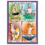 Give the gift of laugh-out-loud humor with the Things You Shouldn’t Do Naked Birthday Card—perfect for anyone who appreciates a little mischievous birthday fun. The front features a hilarious set of cartoon scenes: a woman frying bacon, a man trimming the rose bushes, a man playing the cymbals, and a man jumping on a trampoline… all highlighting things you definitely shouldn’t do naked.
