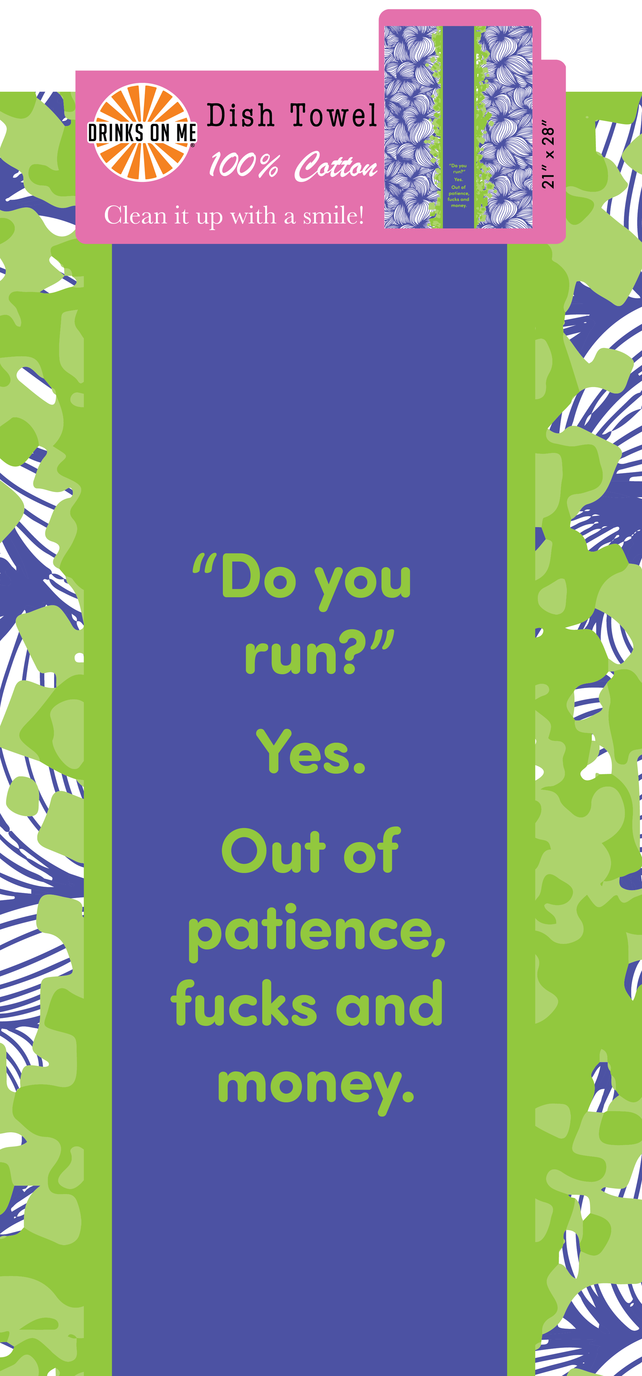 Bring unapologetic humor to your home with our “Do you run? Yes. Out of patience, fucks, and money.” Dish Towel, a boldly honest accessory made for anyone who gets through life with sarcasm and caffeine. This towel delivers laugh-out-loud attitude while still being perfectly practical for everyday use. Ideal for kitchens, coffee bars, bars carts, and gift baskets, it adds instant personality anywhere it hangs.