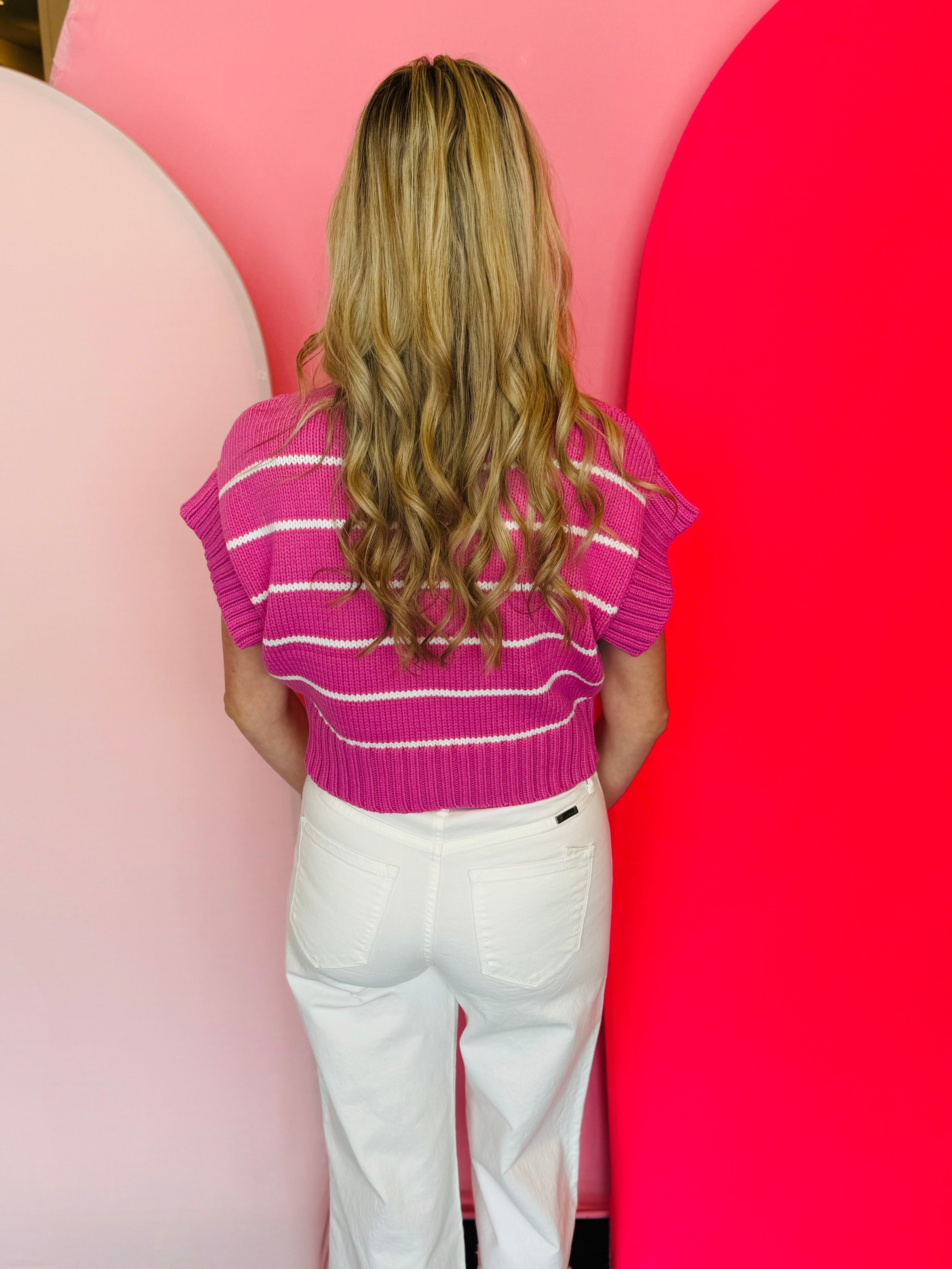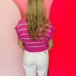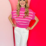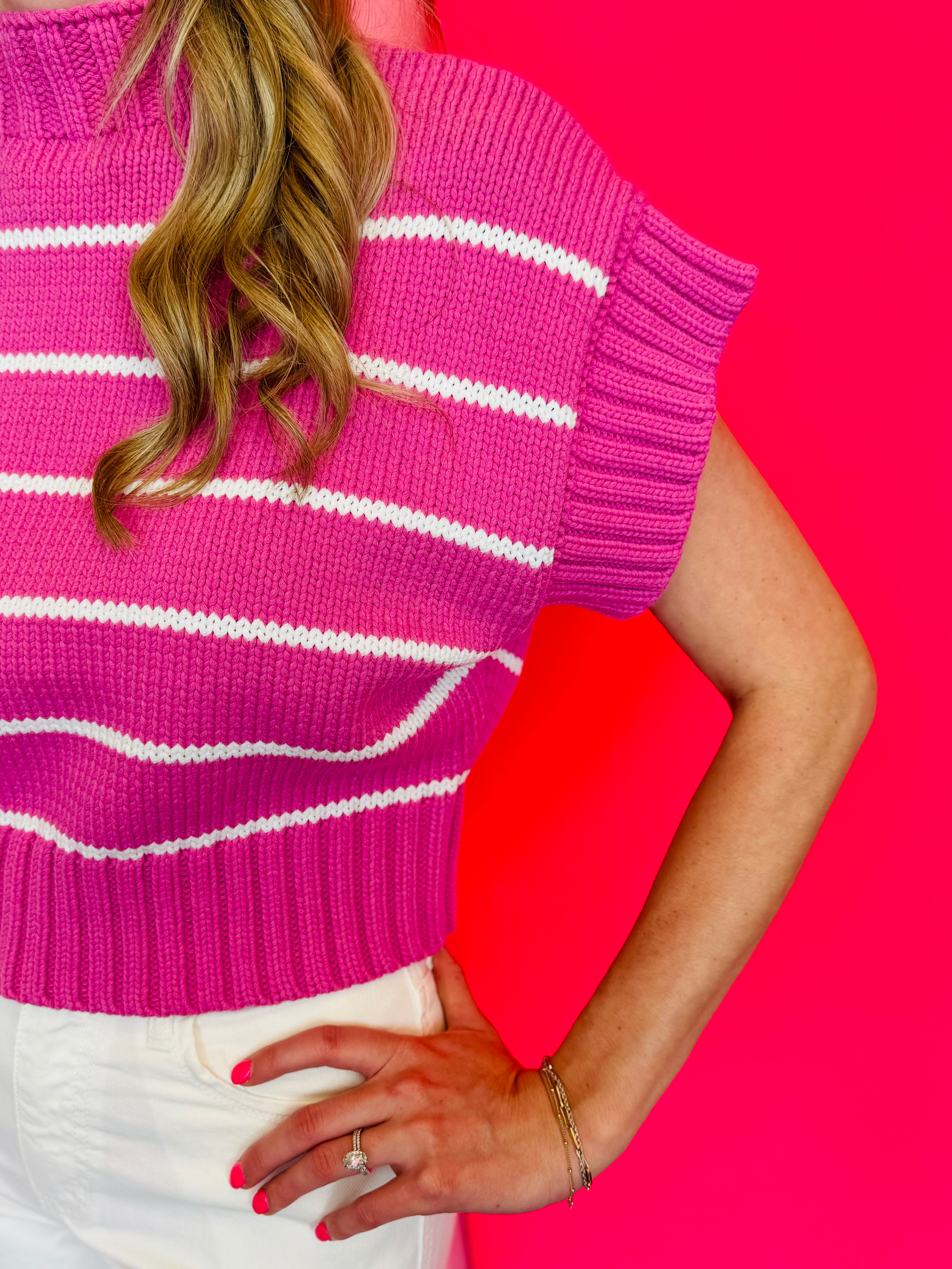Get ready to turn heads in this Bright Pink Striped Mock Neck Sweater! Its flattering cropped cut and trendy mock neck make it a must-have for any fashionista. Lightweight for summer wear.