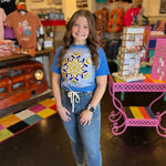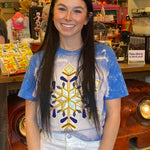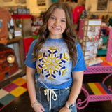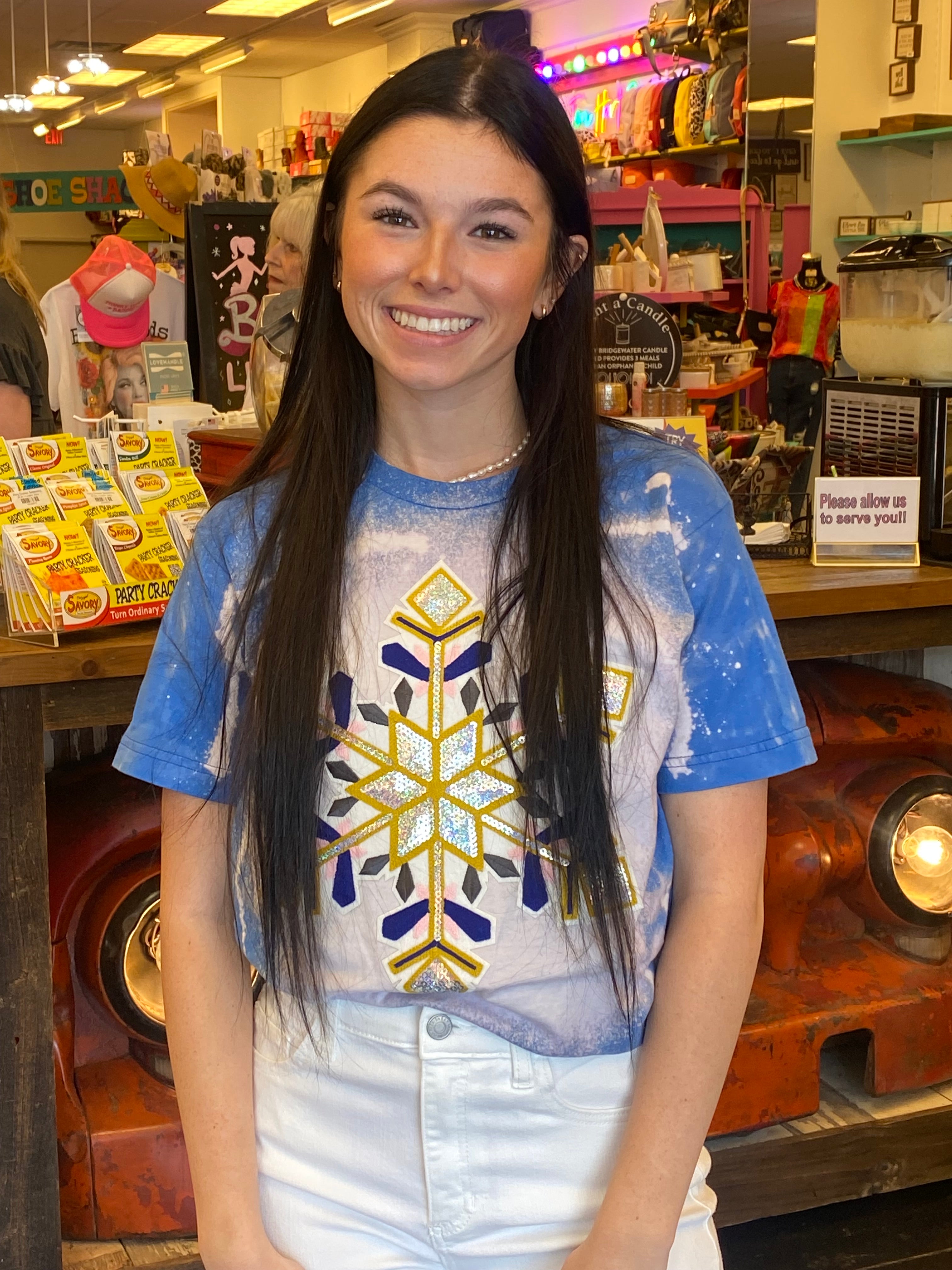 Stay cozy and stylish this winter with this unique Chenille Snowflake Tee! This bleached blue tee has a soft chenille snowflake in cream, mustard, gray, and blush tones, punctuated with sparkly iridescent sequins. All-around it's snow cool!
