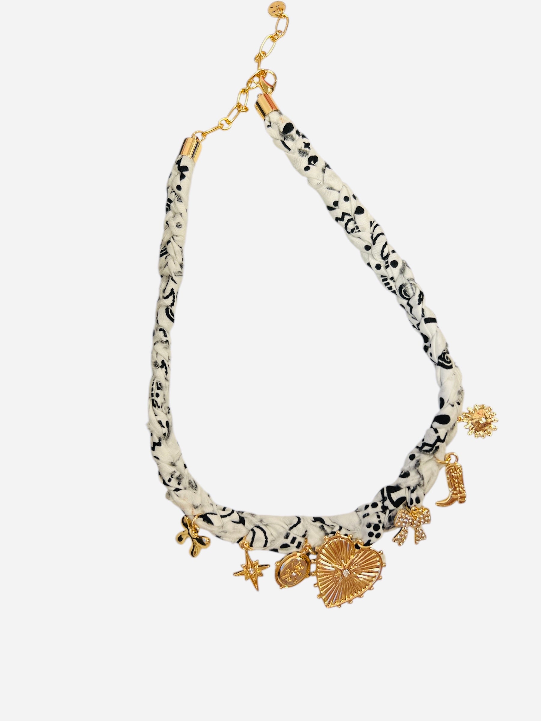 Meet your new statement accessory: the Wild Heart Scarf Necklace, a bold and stylish piece that blends soft fabric comfort with luxe charm details. This unique necklace features a woven black and white fabric cord, offering the perfect mix of texture, flexibility, and lightweight wear. Draping effortlessly like a scarf but shining like jewelry, it’s finished with a stunning lineup of gold-tone charms that bring personality to every outfit. From a radiant etched heart to a shimmering starburst, a playful cowboy boot, a delicate bow charm, and other lucky symbols, each detail adds meaning and boutique-worthy flair. The adjustable gold chain allows for a customizable fit, making it easy to style with sweaters, tees, blouses, or dresses. Whether worn solo or layered, the Wild Heart Scarf Necklace brings a chic, whimsical touch to any look.